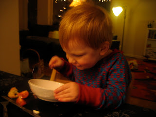 Last night we had lots of special food that mummy had made. She made everything up herself and daddy kept saying "That sounds a good idea, try it!". It was really good. I even found the picture in my bowl that was hidden by lots of food when we started to eat. Today we changed the calendar in the kitchen and went for two long walks in the snow. I used my snow-racer. I had so much fun that I forgot to take my midday nap today! Happy 2008 to everyone.